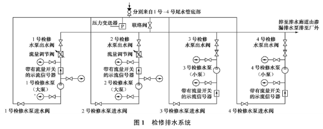 桐柏電站的檢修排水系統,共設4臺排水泵,如圖1所示,1號、2號檢修水泵(大泵)用于排空引水隧洞、蝸殼、尾水管、尾水隧洞內的水;3號、4號檢修水泵(小泵)用于球閥、上下庫閘門等的滲漏排水。每臺檢修水泵均配置逆止閥、壓力表和帶流量開關的示流信號器,在1號、2號水泵出水管處各安裝了一個流量調節閥。系統中共有2根總管,一根為水泵的總吸水管,包括從每臺機組尾水管底部至總管的支管,總吸水管和部分支管及管路上的操作閥門布置在廠房管路廊道中;另一根為總排水管,可將水排至滲漏集水井中,再經滲漏排水泵排至下庫。