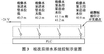 它結構是利用旁通管的原理,主導管內的液位和尾水管內的液位高度一致,根據阿基米德定理,磁性浮子在液體中產生的浮力和重力平衡,當尾水管中的水位升降時,液位計主導管內的浮子也隨之升降,浮子內的永久磁鐵通過磁耦合驅動指示器內的翻板指示器,當液位上升或下降時,翻板指示器由白色翻轉為紅色,或由原來的紅色翻轉為白色,指示器的顏色改變的高度就是被測水位的實際高度,從而實現液位的現場指示,以供運行人員目測尾水管的實時水位。安裝于液位計管壁外側的磁記憶開關,可多點設置、滑動調整位置,提供了液位開關量報警功能。在裝置的頂部安裝了一個自動排氣裝置,當主導管內液位上升時能夠自動的排氣,下降時能夠按時補氣。現場安裝頂裝式磁翻板液位計時,裝置標尺的0位,對應的實地高程為EL.40.0m。浮子開關設定5個水位動作值,檢修水位低開關量報警值對應的高程為40.3m;停止所有檢修水泵的開關量,所對應的高程為40.5m;啟動主用檢修水泵的開關量,所對應的高程為40.9m;啟動檢修水泵主用泵的開關量,以及要求手動啟動大泵,并作為水位高報警上送上位機,所對應的高程為41.1m與41.2m,兩個開關量并列接入。全部開關量分別送入PLC,如圖3所示。