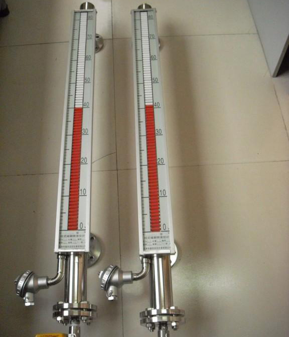 液位計(jì)根據(jù)浮力原理,浮子在測(cè)量管內(nèi)隨液位的升降而上下移動(dòng),浮子內(nèi)的永久磁鋼通過磁耦合作用,驅(qū)動(dòng)紅、白色翻柱翻轉(zhuǎn)180’液位上升時(shí),翻柱由白色轉(zhuǎn)為紅色,下降時(shí),翻柱由紅色轉(zhuǎn)為白色,從而實(shí)現(xiàn)液位的指示。