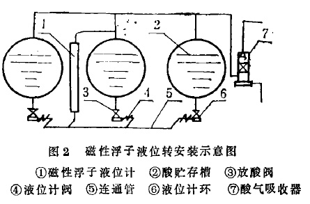 我廠頂裝式磁翻板液位計安裝,采用圖2的形式。三臺酸貯存槽②(三臺以上也可以)合用一臺液位計,每臺酸槽的出口與液位計,共連在一根連通管上⑤。要看某酸槽液位,開該酸槽通液位計的閥門④,液位即可醒目顯示。如此布置能節省兩臺液位計,價值四千余元(酸貯存槽數量越多,節約效果越大)。此外,在安裝時要注意:裝大浮子時重端向上;裝液位標計(小浮標)時,紅色端向上,這樣可防止磁性相斥。裝完后用備用磁鋼,將小浮標引到大浮子磁性材料處,顯示即可正常。目前頂裝式磁翻板液位計在我廠應用情況良好。