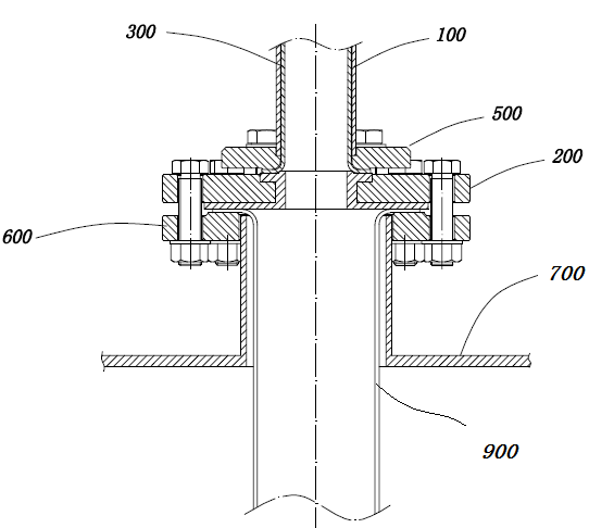 針對傳統頂裝式軟化水液位計的這些弊端,在多次試驗的基礎上,對現有的內襯工藝與結構做了改進,發明了頂裝式軟化水液位計的一種新工藝及其結構,如下圖所示,其提供了*一連接件和連接內襯。該連接內襯具有用于連通內襯連接口的*一連接口、自*一連接口向外成環形設置的*一密封部、用于與被測容器連通的*二連接口和自*二連接口向外成環形設置的*二密封部。由于該*一連接件和連接內襯為單獨設置,可以單獨制造,因此*一密封部和*二密封部可以制作的足夠大,從而實現*一密封部與浮筒內襯的翻折部密封抵接;同時,連接內襯的*二密封部用于與容器實現密封連接。由此,該連接內襯可以與浮筒內襯和容器開口內的護筒形成完全密封的連接,從而避免連接處的金屬面受腐蝕,使生產安全順利地進行,免受因發生生產安全事故對生命和財產造成的安全威脅。