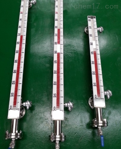 磁翻板液位計(也可稱為磁性浮子液位計)根據浮力原理和磁性耦合作用研制而成。當被測容器中的液位升降時,液位計本體管中的磁性浮子也隨之升降,浮子內的永久磁鋼通過磁耦合傳遞到磁翻柱指示器,驅動紅、白翻柱翻轉180°,當液位上升時翻柱由白色轉變為紅色,當液位下降時翻柱由紅色轉變為白色,指示器的紅白交界處為容器內部液位的實際高度,從而實現液位清晰的指示。