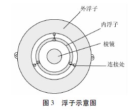 采用雙浮子結構,由內外兩浮子組成,內浮子含有錐體棱鏡,外浮子與內浮子相連以固定內浮子,減少液位變化時內浮子的晃動,如圖3所示。另外該浮子與傳統的浮子式液位計不同,傳統的浮子式液位計的浮子是由測量鋼絲繩懸掛著,而該浮子是沿著導向鋼絲繩自由地隨著液位的升降而上下運動,減小了傳統浮子式液位計存在的機械傳動誤差和鋼絲繩張力對測量數據的影響。