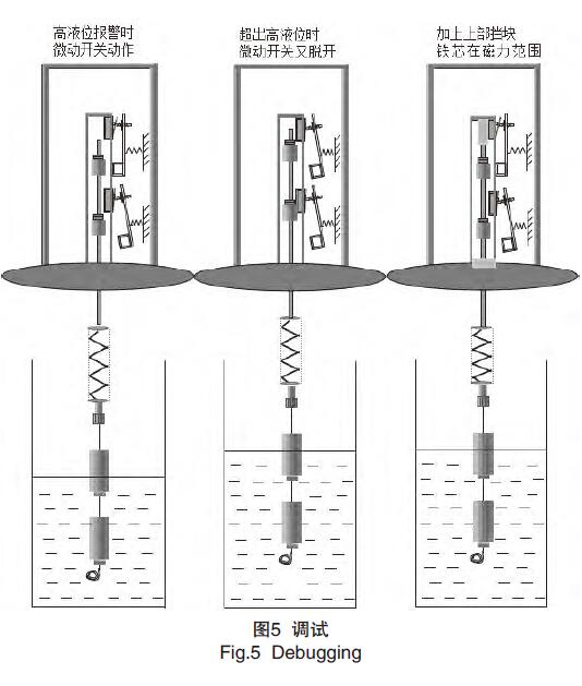 3)在調(diào)試過程中,發(fā)現(xiàn)液位開關(guān)沒有自保持功能,當(dāng)高報(bào)警點(diǎn)過后,液位再往上升則高液位報(bào)警會(huì)消除,低液位時(shí)也是同樣,在分析原因后發(fā)現(xiàn),鐵芯在套筒內(nèi)移動(dòng)的位置不當(dāng)是造成不能自保持的原因,如圖5所示,于是在套筒內(nèi)的鐵芯上方加一阻擋塊,使高液位超出時(shí),鐵芯被阻擋塊擋住,不再向上移動(dòng),從而不會(huì)脫出微動(dòng)開關(guān)的磁力范圍,對低液位報(bào)警的自保持是在鐵芯的下部加一個(gè)環(huán)型的墊片,阻止鐵芯向下移動(dòng)超出微動(dòng)開關(guān)的磁力范圍。從而提高了可靠性和重復(fù)性。接下來的調(diào)試中,又出現(xiàn)了一些零零碎碎的問題,如磁鐵磁性不夠,或者彈簧彈性不夠,彈簧的抗疲勞性差。元器件的材料和加工工藝不理想,出于對核電的安全性和穩(wěn)定性的考慮,開始考慮使用國外公司的產(chǎn)品,在試用后沒有出現(xiàn)以上的問題,于是決定從新采購一批國外的液位開關(guān),將有問題的液位開關(guān)更換成國外的產(chǎn)品。