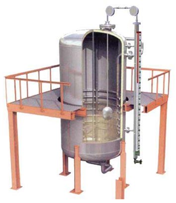 在容器外側(cè)設(shè)一垂直管道,上下通過管道與容器相連,根據(jù)連通管原理當(dāng)容器內(nèi)存有液體時,液體會進(jìn)入垂直管道,并與容器內(nèi)的液面等高。這時在管道內(nèi)置一浮子,則浮子的位置可以反映容器內(nèi)液面。這類液位計的典型品種有磁翻板位計。