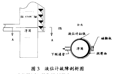 持續向空貯罐加油至液位計指示值37%時,用時約15min。反之,排油液位計回零用時大于40min。在其它區域液位變化則快許多。通過對粗苯防爆液位計結構分析,我們發現:圓柱體浮筒(~58mm×280mm)浮在0% ~37%區間時,形同一個柱塞擋住了液位計簡體下部的聯通管管口(見圖3,