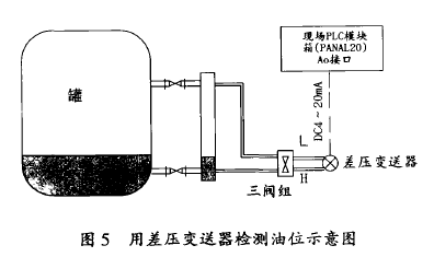 用差壓法檢測油位(△P=p•h)。在上、下聯通管處開孔取壓,選用智能差壓變送器(*大測量范圍0~10kPa,耐壓力1.6 a,輸出DC 4~20mA,帶顯示表)檢測差壓。標定時,取工作用油壓力0~750ram油柱(為保證p值不變)作為輸入,并使表頭指示為0%~100%(線性關系)即可。差壓變送器輸出信號接入現場PLC模塊箱PANAL20的模擬量輸入通道,與軋線計算機聯網(見圖5)。