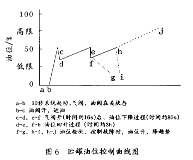 當油位在5O%處時,開關LB/LVL5閉合,計時15s,若信號保持未變,則選通開氣閥,使貯罐油位下降;相反順序關氣閥,使貯罐油位上升。循環工作油位控制在5O%位±200mm范圍內。