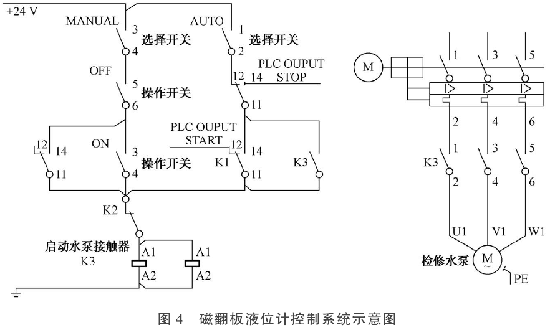 它結構是利用旁通管的原理,主導管內的液位和尾水管內的液位高度一致,根據阿基米德定理,磁性浮子在液體中產生的浮力和重力平衡,當尾水管中的水位升降時,液位計主導管內的浮子也隨之升降,浮子內的永久磁鐵通過磁耦合驅動指示器內的翻板指示器,當液位上升或下降時,翻板指示器由白色翻轉為紅色,或由原來的紅色翻轉為白色,指示器的顏色改變的高度就是被測水位的實際高度,從而實現液位的現場指示,以供運行人員目測尾水管的實時水位。安裝于液位計管壁外側的磁記憶開關,可多點設置、滑動調整位置,提供了液位開關量報警功能。在裝置的頂部安裝了一個自動排氣裝置,當主導管內液位上升時能夠自動的排氣,下降時能夠按時補氣。現場安裝磁浮球液位計時,裝置標尺的0位,對應的實地高程為EL.40.0 m。浮子開關設定5個水位動作值,檢修水位低開關量報警值對應的高程為40.3 m;停止所有檢修水泵的開關量,所對應的高程為40.5 m;啟動主用檢修水泵的開關量,所對應的高程為40.9 m;啟動檢修水泵主用泵的開關量,以及要求手動啟動大泵,并作為水位高報警上送上位機,所對應的高程為41.1 m與41.2 m,兩個開關量并列接入。全部開關量分別送入PLC,如圖3所示。