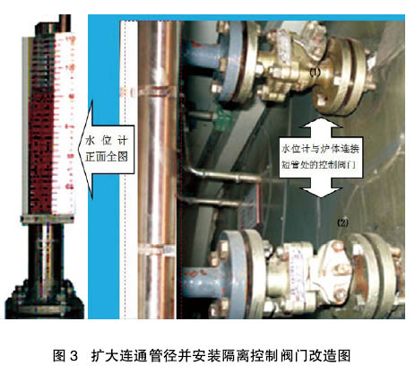 將水位計與爐體之間連通管山原來的ch16mm更換為ch20mm的管段,并安裝兩個控制閥門,通過關閉閥門(1)和(2),實現水位計與爐體隔離(l圖3)。這樣,拆卸水位計時既小需要排低爐水,也避免了對加熱爐真空度的影響。
