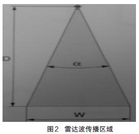 我公司有6臺硫酸儲罐,罐體間可實現連通,為保證測量的精度和安全性,我公司分別在6個罐體上分別安裝了雷達液位計,互為備用,并且在正常情況下還可以實現兩個液位測量值的準確度參照比較。在安裝雷達波液位計時,剛開始采用傾斜的安裝方式,其傾斜角度不超過15°,調試液位計儀表時發現無物位數據顯示,分析故障原因是由于發射的雷達波到達罐體鋼板上反射回來的,其主要原因是產生的虛假回波干擾太大造成的。重新調整雷達液位計的安裝角度后發現出現物位數據,但該數據波動很大,并且由于分析原因可能是因為液面波動對雷達波反射造成影響,基于此原因,決定在罐內的測量筒內安裝反射板,重新調整雷達物位計的安裝,使其雷達波的發射天線平面與反射板平行,這樣測得的物位數據比較準確。反射板的面積計算:采用FMR530智能型雷達液位計,其天線尺寸參數DN80/3",波束角α=10°,雷達波傳播的區域如圖2 所示。根據公式Tan5°=W/2D,可求出W=900 mm,進而求出反射板的面積。因此我們可以制作一個直徑不小于900 mm的圓盤即可。