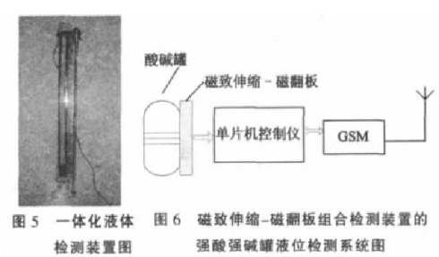 目前,工業用濃酸、濃堿液罐內的液位檢測手段,主要有超聲波液位檢測儀、磁翻板液位計、接觸式防腐蝕液位檢測裝置等。2007年05月,作者參觀了山西省陽城電廠,對陽城電廠的酸堿罐液位檢測裝置進行了考察;該廠現有大小20余個酸堿罐中酸堿液位的檢測,大都采用超聲波液位計與磁翻板液位計相結合的方式。超聲波液位計對酸堿液位信息通過線路傳輸到計算機,進行實時觀測。但據該廠技術人員介紹,超聲波液位計有一個致命缺點,就是安裝在罐頂部的超聲波探頭很容易被酸霧或堿霧籠罩,嚴重影響了測量準確度,需要工作人員定時對超聲波探頭進行清洗。磁翻板液位計沒有數據的自動傳輸功能,需要工作人員定時地去觀察液位刻度。為了確保酸堿液位數據的可靠性,該廠技術人員提出增加一套液位檢測裝置的要求,并能實現數據的自動化遠程傳輸。為此,作者利用磁致伸縮傳感器和磁翻板相結合的辦法,以求實現酸堿液位的非接觸式測量,并利用單片機和GSM技術,實現磁致伸縮液位信號的無線傳輸。