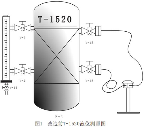 原T-1520液位測量為下圖1所示,左側為電遠傳磁翻板液位計,右側為雙法蘭磁性浮子液位計。