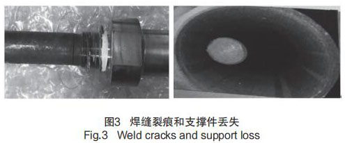 在歷次大修執(zhí)行 GSS 系統(tǒng) MSR 純水處理液位計(jì)預(yù)防性維修檢查時(shí)發(fā)現(xiàn),部分導(dǎo)波桿支撐件破碎并丟失,同時(shí)存在探桿根部焊縫有裂痕的問題,見圖 3 焊縫裂痕和支撐件丟失。