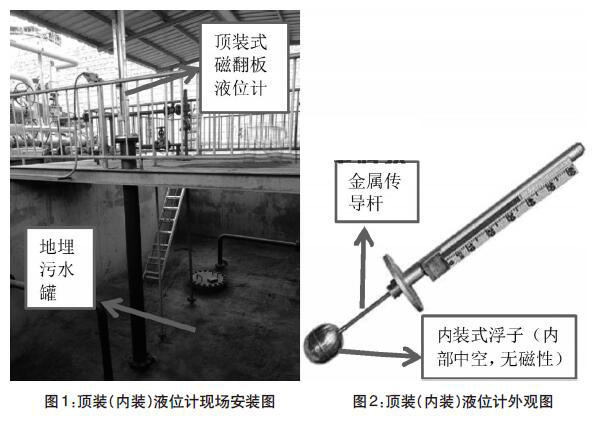 該區(qū)塊集氣站使用的是地埋污水罐,主要作用是對(duì)集氣站內(nèi)生產(chǎn)污水進(jìn)行沉降。在運(yùn)行過(guò)程中,冷凝水液位計(jì)故障導(dǎo)致顯示數(shù)據(jù)不準(zhǔn),一方面對(duì)污水液位情況掌握不準(zhǔn)確,另一方面會(huì)出現(xiàn)不安全因素,甚至安全事故。該井區(qū)地埋污水罐使用的液位計(jì)為頂裝式磁翻板(磁浮子)液位計(jì),根據(jù)液位計(jì)磁性材質(zhì)所在位置的不同冷凝水液位計(jì)也稱(chēng)為內(nèi)裝式磁翻板液位計(jì)。