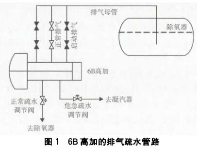 6B高壓加熱器設有2路啟動排氣和1路正常排氣,3路排氣管道匯至1根管道進人除氧器并插人除氧器正常液面以下,如圖1所示。啟動階段高壓加熱器啟動排氣閥門和正常排氣閥門均開啟排氣,正常運行時啟動排氣閥關閉,正常排氣閥開啟。排氣管線從7.5 m平臺經(jīng)過多次折向匯集到23 m排氣母管,然后再引人除氧器,這導致排氣管線存有蒸汽冷凝水;由于在排氣管線上存有一定的冷凝水,啟動排氣閥開啟后,存在于排氣管道的冷凝水依靠重力排至高壓加熱器汽側(cè),在啟動排氣管至除氧器的管路中形成一定的真空,從而產(chǎn)生虹吸作用,使除氧器的水吸人6B高壓加熱器,導致B側(cè)高壓加熱器液位異常升高而發(fā)生解列。