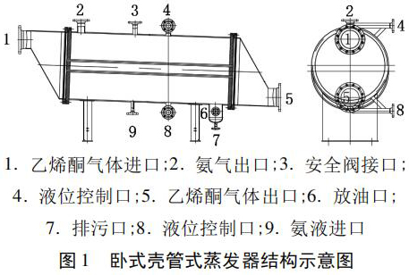 廣西某化工實(shí)業(yè)有限公司購進(jìn)了四臺靖江容器制造有限公司生產(chǎn)的換熱面積為 26. 3 m3 的臥式殼管式蒸發(fā)器,廠家提供的結(jié)構(gòu)示意圖見圖 1,主要用于冷卻乙烯酮?dú)怏w,要求四臺臥式殼管式蒸發(fā)器出口的乙烯酮?dú)怏w溫度依次為 - 5℃、- 10℃、- 15℃、 - 20℃,以分離出乙烯酮?dú)怏w中的水和醋酸,并防止結(jié)冰。