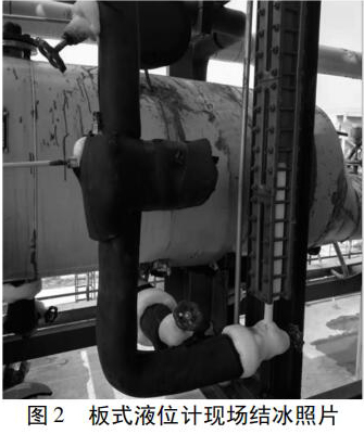制冷系統(tǒng)調(diào)試運(yùn)行時,發(fā)現(xiàn)防霜磁翻板液位計(jì)的底部開始有氨氣泡形成,徐徐上升到液面消失,并且液面上下浮動,幅度較大,不能穩(wěn)定在某一位置內(nèi)。隨著系統(tǒng)的運(yùn)行,液位計(jì)的下部開始結(jié)露、結(jié)霜,結(jié)霜高度逐漸增加,并由霜轉(zhuǎn)化為冰,無法觀察到液位,見圖 2。同時,螺桿式制冷壓縮機(jī)出現(xiàn)了“潮車”現(xiàn)象。由于操作者無法判斷液位的準(zhǔn)確位置,為防止事故發(fā)生,被迫停機(jī),嚴(yán)重影響了物料的生產(chǎn)。