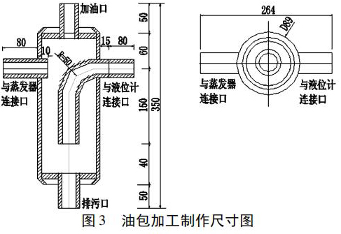1. 現(xiàn)場加工制作油包。油包式液位計(jì)包括油包和防霜磁翻板液位計(jì)兩部分,通 過 管 道、閥 門 連 接 而成。油包是油包式液位計(jì)的關(guān)鍵部件,容積過小或與防霜磁翻板液位計(jì)連接不符合要求,有可能造成液位上升、下降緩慢,液位反應(yīng)不靈敏,或者油包結(jié)霜。圖 3 為油包加工制作尺寸圖,現(xiàn)場加工按圖紙要求制作。