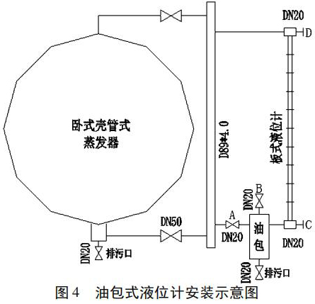 3. 安裝油包式液位計(jì)。根據(jù)現(xiàn)場的臥式殼管式蒸發(fā)器的實(shí)際情況,繪制了油包式液位計(jì)安裝示意圖( 圖 4) ,在排污口通向大氣、安全員現(xiàn)場監(jiān)督的情況下,實(shí)施焊接、安裝。
