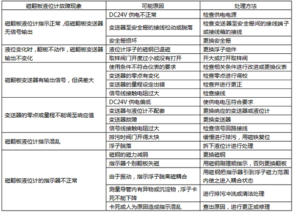 先觀察玻璃液位計的指示,翻板液位計顯示與其不符,確定工藝液位正常,可對翻板液位計進行排污沖洗,排污時要先關閉上部的取樣閥,排污過程中開,關閥門一定要緩慢,排污后故障依舊,可用磁鐵從下往上對翻板進行磁性吸引,翻板能正常變化,則翻板沒有問題。在磁性吸引時翻板不能隨著變化,應檢查玻璃或塑料護板有沒有變形,護板變形會造成翻板中軸不同心而不能翻轉。浮子中的磁鋼使用時間過長,磁性減弱,浮子中的磁鋼與翻板的小磁鋼之間失去磁連接作用,也會出現翻板不會動作的故障。