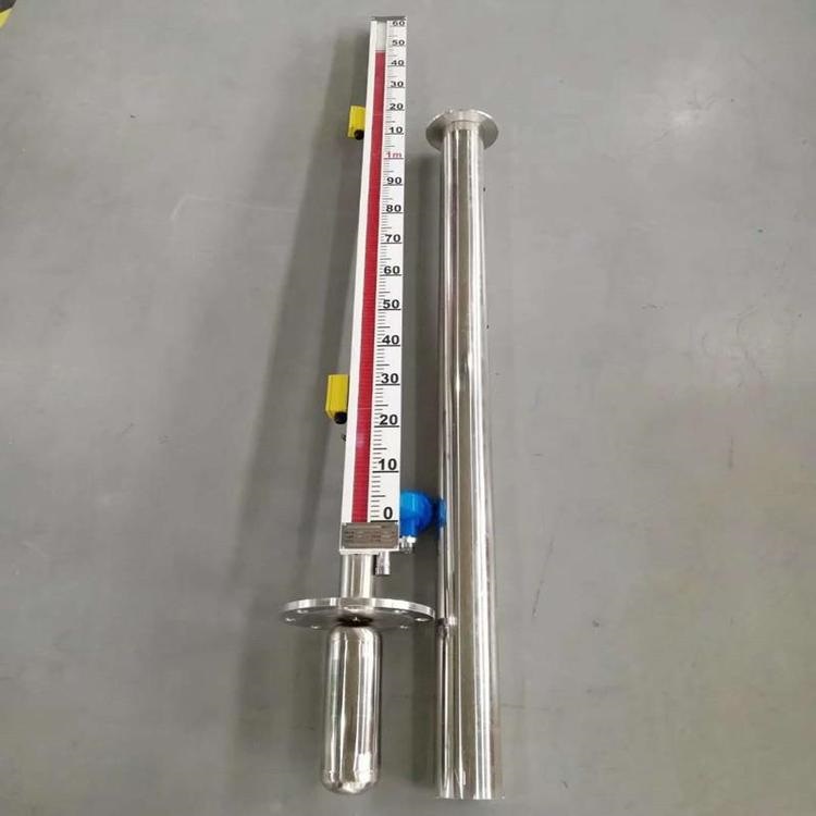 原理:根據浮力原理和磁性耦合原理而制成的,當被測容器內的液位上下變化時帶動浮球,并通過與之相連的連桿上端的永久磁鋼上下移動,經磁性藕合而使顯示器中的翻柱翻轉。當液位上升,翻柱由白色轉為紅色,當液位下降時翻柱由紅色轉為白色,紅白界位處就為容器內介質液位的實際高度,從而實現液位自動跟蹤顯示。