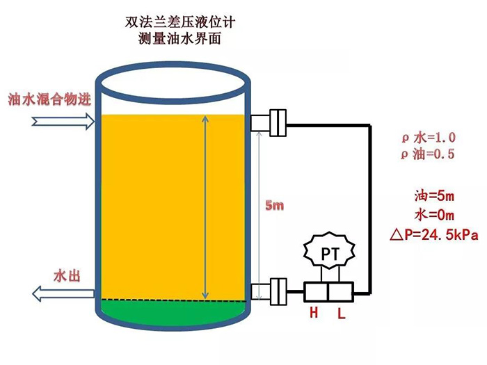 水的密度為1.0,油的密度為0.5,變送器的硅油密度為0.93,測量范圍5m,求油面在5m時變送器的差壓值。