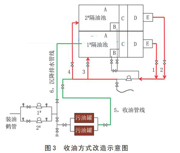針對(duì)拉運(yùn)頻次高,成本費(fèi)用高,危廢產(chǎn)量大的問(wèn)題,將原環(huán)保試驗(yàn)污水罐改造為污油暫存罐,增設(shè)隔油池收油池至污油罐流程 (圖 3,流程 5),將收集的污油集中在污油罐內(nèi),達(dá)到一定液位后,用罐車(chē)?yán)\(yùn)至輪南環(huán)保站。該措施提高了污油儲(chǔ)存容積,大大降低了罐車(chē)?yán)\(yùn)頻次。同時(shí),增加污油暫存罐至隔油池流程 (圖 3,流程 6),罐內(nèi)污油重力沉降后,底部污水壓排至隔油池,降低了污油中混水比例,大大減少了轉(zhuǎn)運(yùn)危廢的數(shù)量。