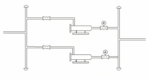 在輸氣站場根據(jù)下游用戶年設(shè)計(jì)輸氣量及檢維修需求通常設(shè)置兩臺臥式過濾分離器,運(yùn)行時(shí)通常采用一用一備方式運(yùn)行,氣量需求高峰時(shí)段達(dá)到單臺處理量時(shí)兩臺同時(shí)運(yùn)行以滿足用戶氣量需求。過濾分離器在整個(gè)輸氣站場工藝流程中通過法蘭與管道相連,同時(shí)上下游均設(shè)置球閥(見圖1),其中下游球閥與電動執(zhí)行機(jī)構(gòu)相匹配使用,能實(shí)現(xiàn)遠(yuǎn)程開關(guān)控制。在正常運(yùn)行狀態(tài)下,在用過濾分離支路的上下游球閥處于完全開啟狀態(tài),備用過濾分離支路的上游球閥處于開啟狀態(tài),下游球閥處于關(guān)閉狀態(tài)。對于過濾分離器切換有兩種方式:一種是手動模式,另一種是自動模式。在手動模式下可由操作人員通過遠(yuǎn)程和就地狀態(tài)下實(shí)現(xiàn)過濾支路流程切換;當(dāng)在自動模式下電動閥產(chǎn)生事故關(guān)斷時(shí),則報(bào)警并自動選擇備用設(shè)備,打開備用支路的電動閥,關(guān)閉當(dāng)前支路的電動閥門,實(shí)現(xiàn)工作分離器和備用分離器的切換,上述過程由程序自動完成,不需人為干預(yù)。